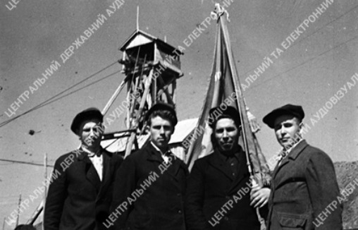 Комсомольсько-молодіжна бригада бурильників рудоуправління ім. Ілліча, яка отримала перехідний Червоний прапор ЦК ВЛКСМ та Народного комісаріату чорної металургії, прапор тресту «Дзержинськруда» та ЛКСМУ. Зліва направо: Г. Є. Тимченко, М. Г. Білозір, І. І. Стадник та Л. Є. Шевченко. 1945 р. Бондаренко.