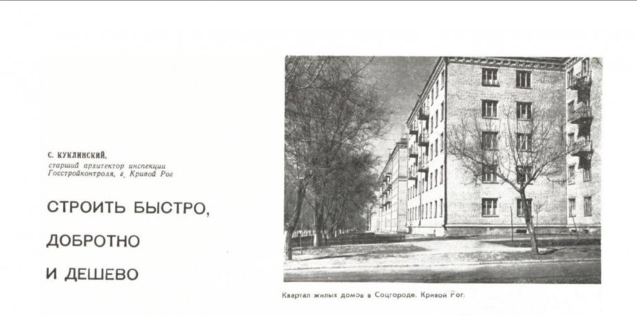 «Однак якість будівельно-монтажних робіт у Кривбасі не завжди перебуває на належному рівні. Досить сказати, що з 216 тис. м² житлової площі, введеної в експлуатацію у 1959 р., лише 41 тис. м² отримали добру оцінку. Нерідко до здачі подаються об’єкти з великою кількістю недоробок і дефектів».