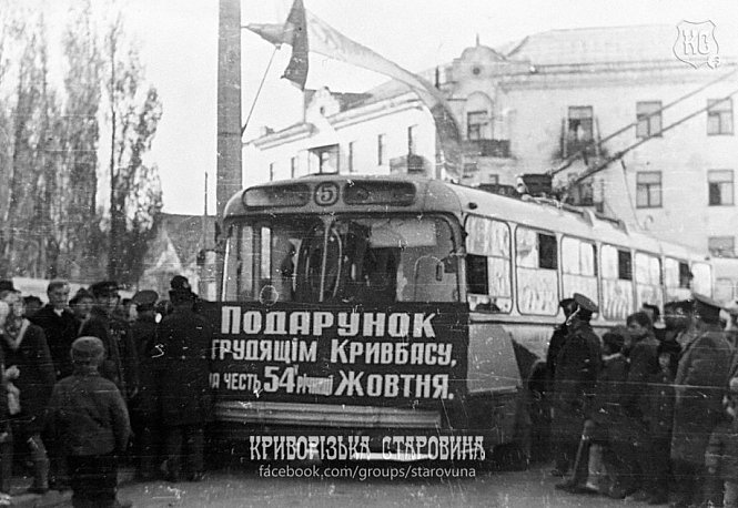 Відкриття тролейбусної лінії до житломасиву рудника ім. Кірова. На світлині тролейбус № 5. З фондів Десята бібліотека.