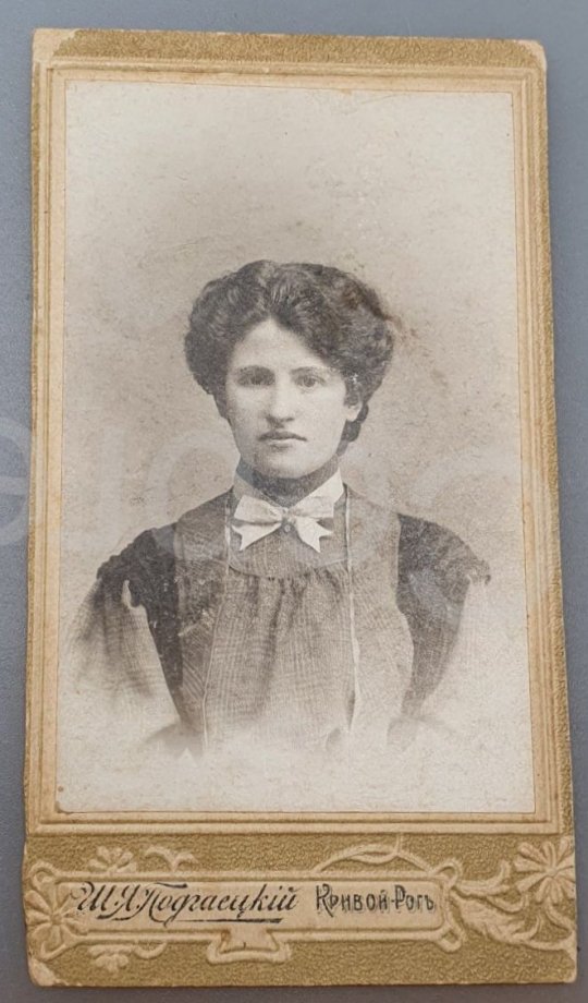 На фото — студійний портрет жінки у стриманому одязі з характерною зачіскою. Світлина зроблена у фотографії криворізького фотомитця Шмуеля Подгаєцького