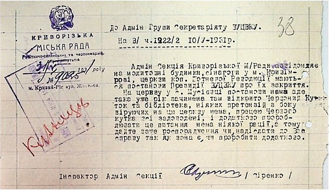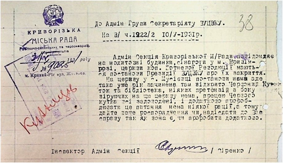 Матеріали справи (1930–1931 рр.) стосуються закриття церкви в селі Мусіївка Криворізького району та передачі її під культурні потреби