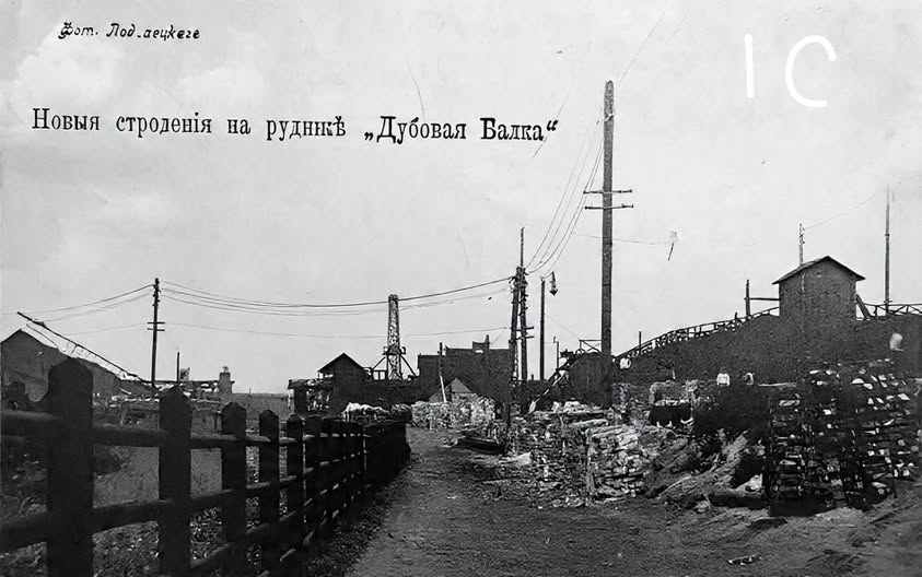 Робоча зона рудника в період розбудови, поштівка, початок ХХ століття.