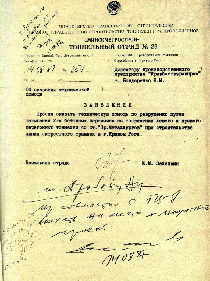 Просим оказать техническую помощь по разрушению путем взрывания 2-х бетонных перемычек на сопряжении левого и правого перегонных тоннелей со ст. «Пр. Металлургов» при строительстве линии скоростного трамвая в г. Кривом Роге.