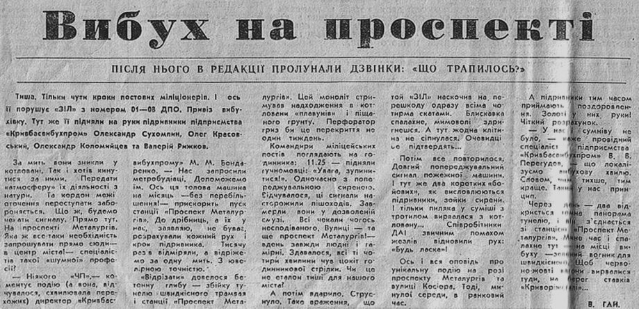 Ніякого «ЧП», — коментує подію (а воно, відчувалося, схвилювало перехожих) директор «Кривбасвибухпрому» М.М. Бондаренко. — Нас запросили метробудівці. Допомогли їм. Ось та нова машина на місці — без перебільшення прискорить пуск станції «Проспект Металургів». До дрібниць, до дрібниць у нас розрахований кожний рух; кожний підрив — раз, два, три — і все в одну мить. З ювелірною точністю.